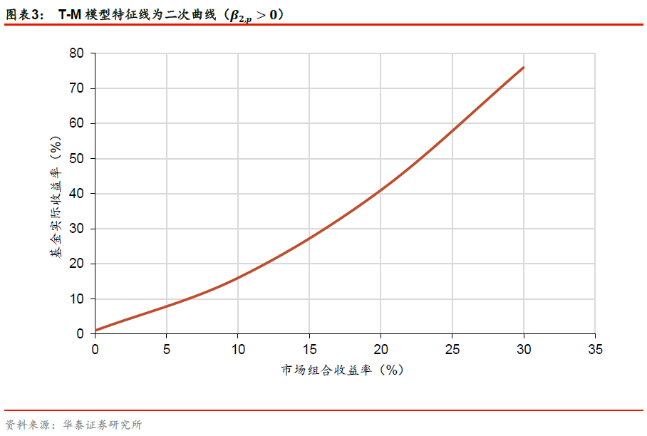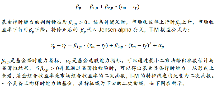 1966年,Treynor与Mazuy提出,基金回报-市场回报曲线是非线性的。T-M模型假设,基金经理能发挥时机选择能力预测市场收益率,具备正向择时能力的基金经理,会在预测市场收益率升高时增大投资组合的贝塔,在预测市场收益率降低时减小投资组合贝塔。由此,T-M模型将Jensen单因素模型中的βp修正为: