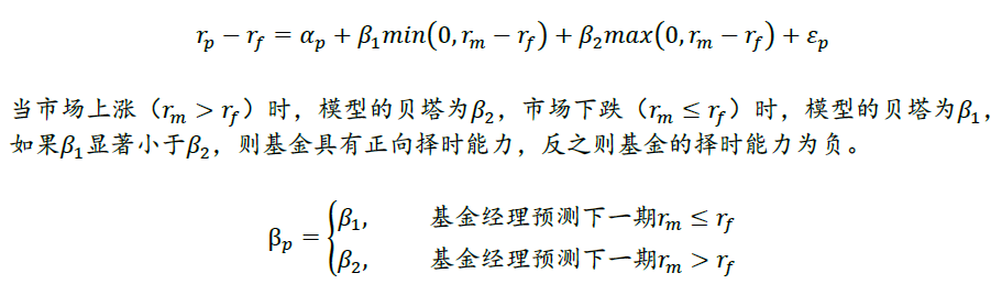 1981年Henriksson与Merton提出新的评估基金绩效模型,将基金经理择时能力定义为“基金经理能够预测市场收益高于无风险收益”的能力。基金经理只关心市场组合收益率是否超过无风险利率,而不关心超过的幅度大小。模型公式如下: