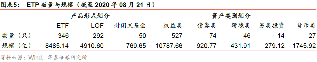 我国ETP按资产类别可分为权益类、债券类、跨境类、另类投资类和货币类。据Wind数据统计,截至2020年08月21日,在不考虑分级基金的情况下,我国权益类ETP包括股票型和混合型基金,共计527支产品;债券类ETP包括债券ETF、债券LOF和债券型封闭式基金,共计74支产品;跨境类ETP主要包括跨境类ETF和跨境类LOF,共计46支产品;另类投资ETF有9支黄金ETF、1支白银LOF、1支豆粕ETF、1支REITs基金、1支有色金属ETF和1支能源化工基金;货币类ETP共计27支产品。