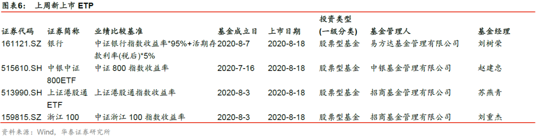 易方达基金管理有限公司的银行(161121.SZ)于2020年8月18日上市,基金经理刘树荣,业绩比较标准为中证银行指数收益率*95%+活期存款利率(税后)*5%。中银基金管理有限公司的中银中证800ETF(515610.SH)于2020年8月18日上市,基金经理赵建忠,业绩比较标准为中证800指数收益率。招商基金管理有限公司的上证港股通ETF(513990.SH)于2020年8月18日上市,基金经理苏燕青,业绩比较标准为上证港股通指数收益率。招商基金管理有限公司的浙江100(159815.SZ)于2020年8月18日上市,基金经理刘重杰,业绩比较标准为中证浙江100指数收益率。