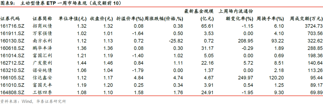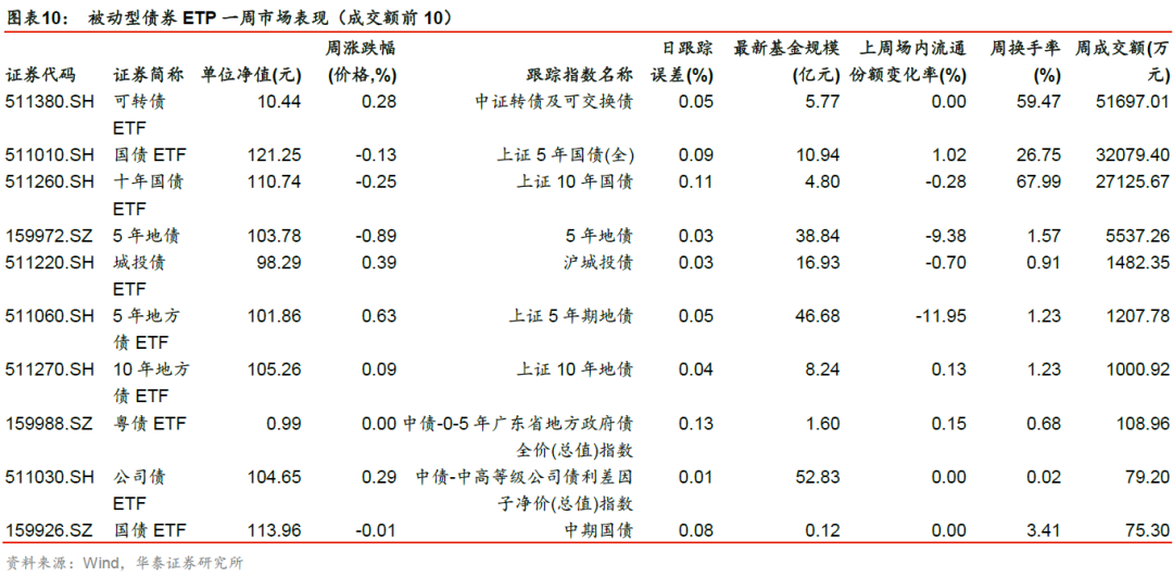 上周债券类ETP表现平淡。成交额前10的主动型债券ETP多数上涨,有8支上涨、1支下跌、1支持平,其中信达鑫安(166105.SZ)涨幅最高,为4.74%。成交额前10的被动型债券ETP多数上涨,有5支上涨、4支下跌、1支持平,其中5年地方债ETF(511060.SH)涨幅最高,为0.63%。
