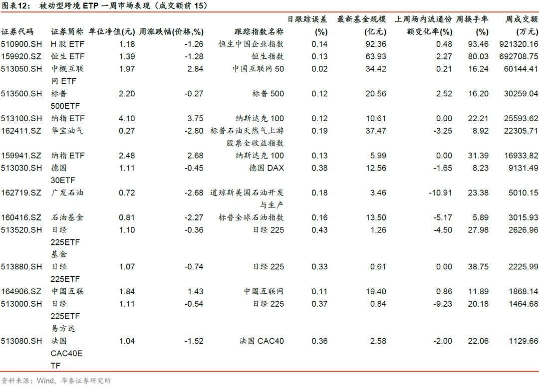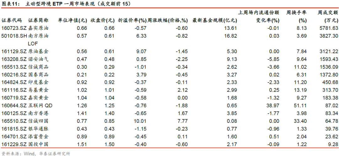 上周跨境类ETP表现不佳。成交额前15的主动型跨境ETP多数下跌,有10支下跌、4支上涨、1支持平,其中诺安油气(163208.SZ)跌幅最高,为2.25%。成交额前15的被动型跨境ETP多数下跌,有11支下跌、4支上涨,其中华宝油气(162411.SZ)跌幅最高,为2.80%。