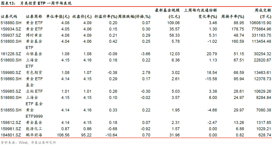 上周另类投资ETP中,贵金属ETP多数上涨,有7支上涨、3支下跌,其中有色期货(159980.SZ)涨幅最高,为2.78%。豆粕ETF(159985.SZ )下跌0.30%;REITs基金鹏华前海(184801.SZ)上涨0.70%;能源化工(159981.SZ)下跌0.92%。