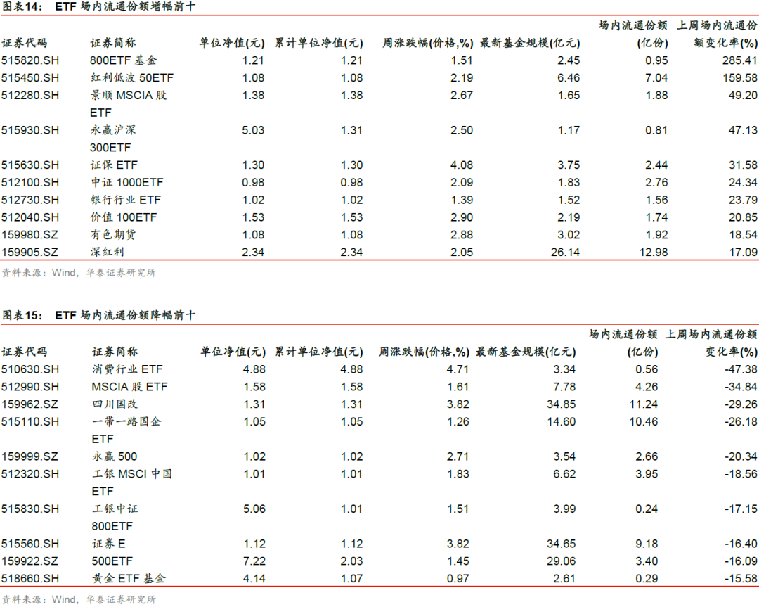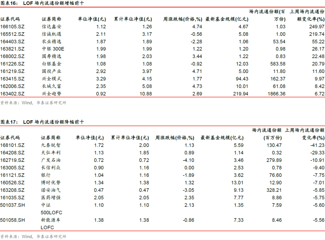上周ETF中,800ETF基金(515820.SH)场内流通份额增幅最大,为285.41%,流通份额增至945.26万份。消费行业ETF(510630.SH)场内流通份额降幅最大,上周降幅达47.38%,目前场内流通份额降为560.90万份。上周LOF中,信达鑫安(166105.SZ)场内流通份额增幅最大,为249.97%,流通份额增至102.51万份。九泰锐智(168101.SZ)场内流通份额降幅最大,上周降幅达41.23%,目前场内流通份额降为1.30亿份。