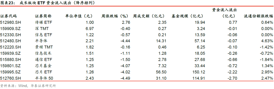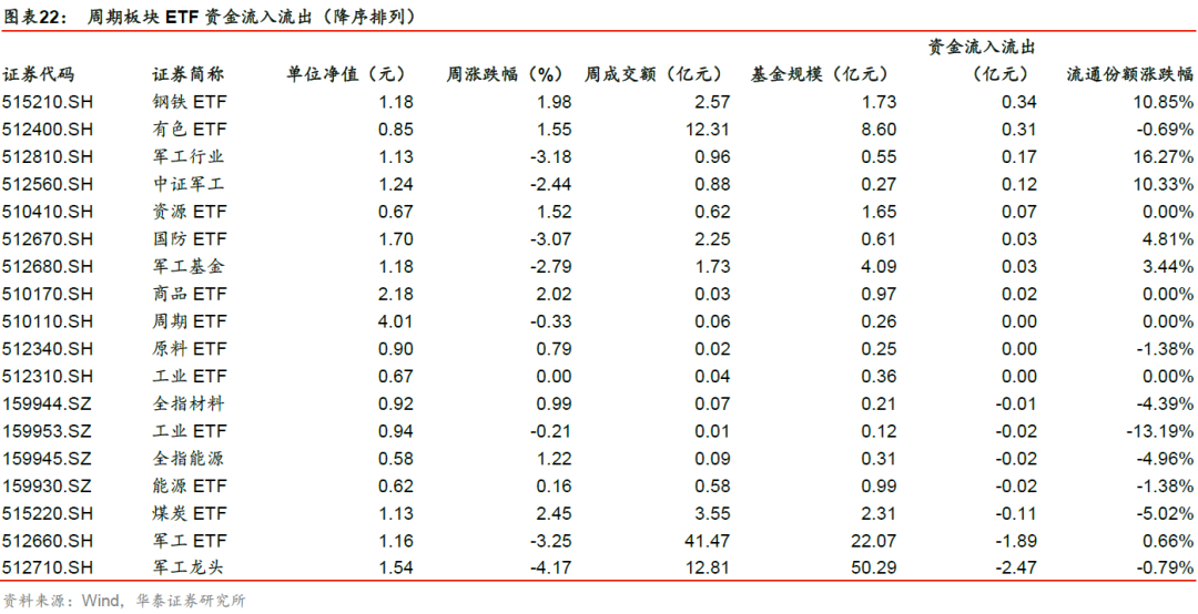 上周行业ETF中,大金融板块多数ETF资金流入,证券ETF(512880.SH)净流入最多,为22.74亿元。消费板块中多数ETF资金流出,消费ETF(159928.SZ)净流入最多,为1.46亿元。在周期板块,多数ETF资金流入,钢铁ETF(515210.SH)净流入最多,为0.34亿元。成长板块中多数ETF资金流出,传媒ETF(512980.SH)净流入最多,为0.77亿元。
