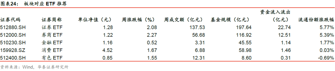 上周周内大盘整体呈现震荡走势。大金融板块多数ETF资金流入,大多ETF净值上涨;消费板块ETF多数资金流出,整体表现较为平淡;周期板块ETF涨跌参半,军工相关ETF全部有明显下跌;成长板块几乎全部ETF资金流出且跌幅明显。本周建议关注以下产品:证券ETF(512880.SH),券商ETF(512000.SH),金融ETF(510230.SH),消费ETF(159928.SZ),有色ETF(512400.SH)。