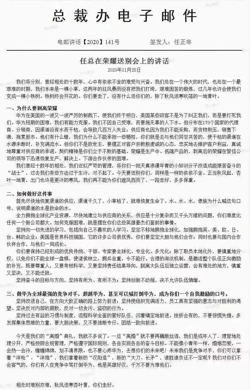 11月26日,任正非在荣耀送别会上的讲话在全网刷屏,任老的一席话不仅令世人振聋发聩,也让世人了解到了华为出售荣耀的原因以及未来的发展。