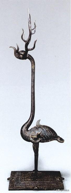 有一只鹿角立鹤与悬鼓同室,鹤引颈昂首伫立,鹤首插着两只青铜制成的鹿角,鹤颈和鹿角上刻着金色饰纹,四面和中心都有壁虎形的铺首衔环。鹿角立鹤是一件非常罕见的艺术珍品,其用途仍存在诸多争议。有人认为它是楚墓中镇墓兽的殉葬品,也有学者认为它是悬鼓的底座。