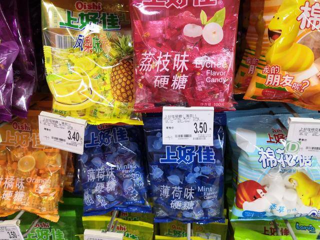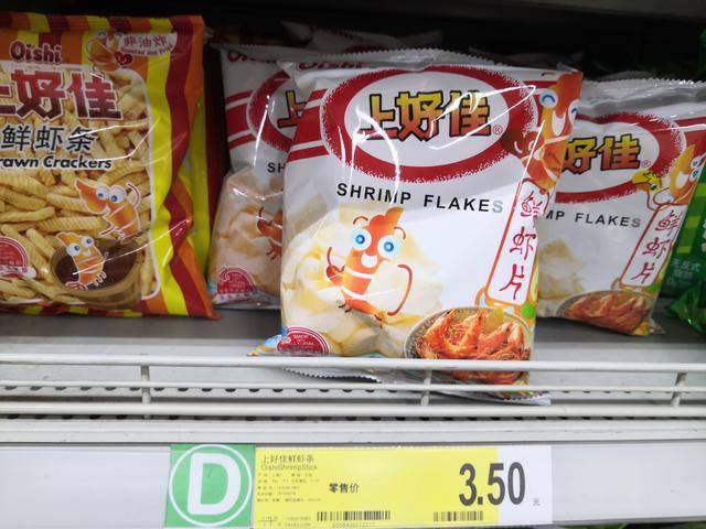 11月14日,扬子晚报/紫牛新闻记者在南京家乐福河西店看到,“上好佳”的膨化食品除了有传统的薯片、虾条、虾片、芝士条,还有玉米卷、鱼余等产品。除此以外,“上好佳”还有很多口味的糖果。