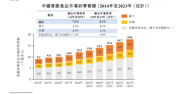 不过,另一方面,零食市场的整体潜力也依然很大。以中国的薯片市场为例,按2018年的零售额计,薯片在香脆休闲食品市场中占最大份额,即27%,并呈现出最快的增速。零售额由2014年的24亿美元增至2018年的33亿美元,复合年增长率为8.3%,预计2023年达49亿美元。
