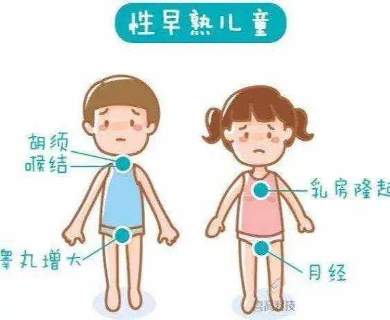 性早熟:指女孩8岁、男孩9岁以前呈现第二性征。男孩女孩均出现身高和体重过快增长,女孩表现为乳房发育,阴毛、腋毛出现,月经来潮等,男孩表现为睾丸容积增大,阴茎增长增粗,胡须、阴毛出现等。