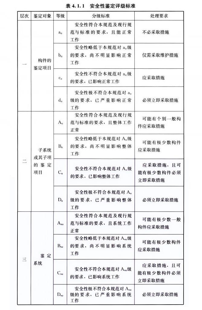 4.1.1既有建筑的安全性鉴定,应按构件、子系统和鉴定系统三个层次,每一层次划分为四个安全性等级。各层次的评级标准应符合表4.1.1的规定。