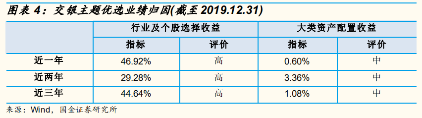 “交银研究部团队现有约20名研究员以及数名助理,每年每人会贡献3个左右投资机会,加起来就有60~70个,”交银的投研结构较为紧密,因此研究推荐采纳比例较高。依托公司强大的选股平台和良好的投研互动氛围,沈楠的产品在行业配置及个股选择层面实现了较好的超额收益(详见图表4)。