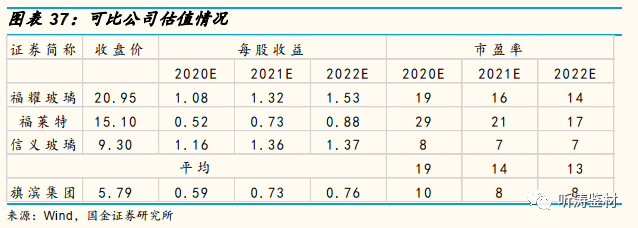 我们选取福耀玻璃等玻璃企业作为可比公司,采用市盈率相对估值法对旗滨集团进行估值。根据Wind一致预期,可比公司2020年平均估值为19倍、2021年平均估值为14倍、2022年平均估值为13倍。
