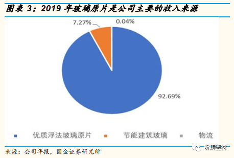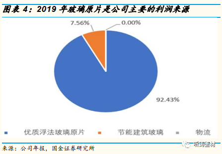 公司主营业务分为浮法玻璃原片、节能建筑玻璃和物流三大板块,玻璃原片业务依然是公司主要的收入和利润来源,但节能建筑玻璃(玻璃深加工)业务占比在迅速提升。2019年公司主营业务收入92.00亿元,毛利26.67亿元。其中,优质浮法玻璃原片业务实现营收85.28亿元,占比92.69%,毛利24.66亿元,占比92.43%;节能建筑玻璃业务实现营收6.69亿元,占比7.27%,毛利2.02亿元,占比7.56%。