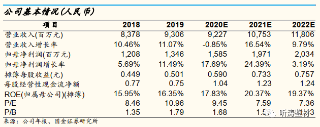 2) 预计公司2020-2022年归母净利润分别为15.85亿元/19.71亿元/20.34亿元,同比变动18%/24%/3%;对应EPS分别为0.59元/0.73元/0.76元。