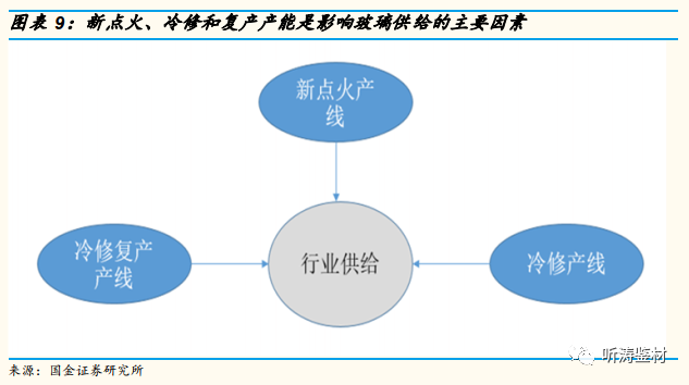 玻璃产线供给刚性的特征,使得在产产能能够较为真实的反映供给情况。我们认为,影响玻璃行业供给变化的主要因素,分别是:新点火产能、冷修复产产能和冷修产能。
