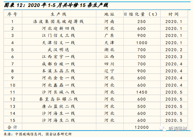 2020年一季度市场下行,再现产线集中冷修场景。2020年初以来受新冠疫情影响,下游需求大幅下滑,在高库存压力下,同时叠加窑龄到期和沙河地区环保趋严,已有多条产线进行冷修。截至202年5月31日,已有15条产线冷修,合计产能12000t/d,有望复制2019年6月份行业集中冷修后玻璃行情触底回升的局面。