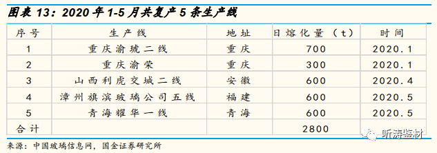 玻璃生产线冷修时间通常为半年左右,在行情好转后,企业多数会选择积极复产。2019年全国共有16条玻璃产线复产,合计产能10500t/d,但多集中在5月份行情向好之后。因此按照通常半年至一年的冷修周期推算,未来冷修复产增量主要集中在2019年及之后的冷修产线,整体有限。