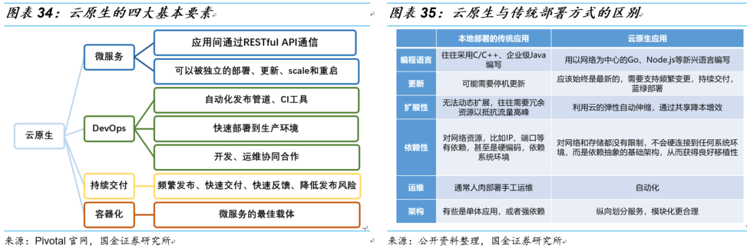 云原生最早在2013年由Pivotal公司的Matt Stine提出。目前,Pivotal官网对云原生最新的定义即4个要点:DevOps+持续交付+微服务+容器。根据这种定义,符合云原生架构的应用程序应该是:采用开源堆栈(K8S+Docker)进行容器化,基于微服务架构提高灵活性和可维护性,借助敏捷方法、DevOps支持持续迭代和运维自动化,利用云平台设施实现弹性伸缩、动态调度、优化资源利用率。