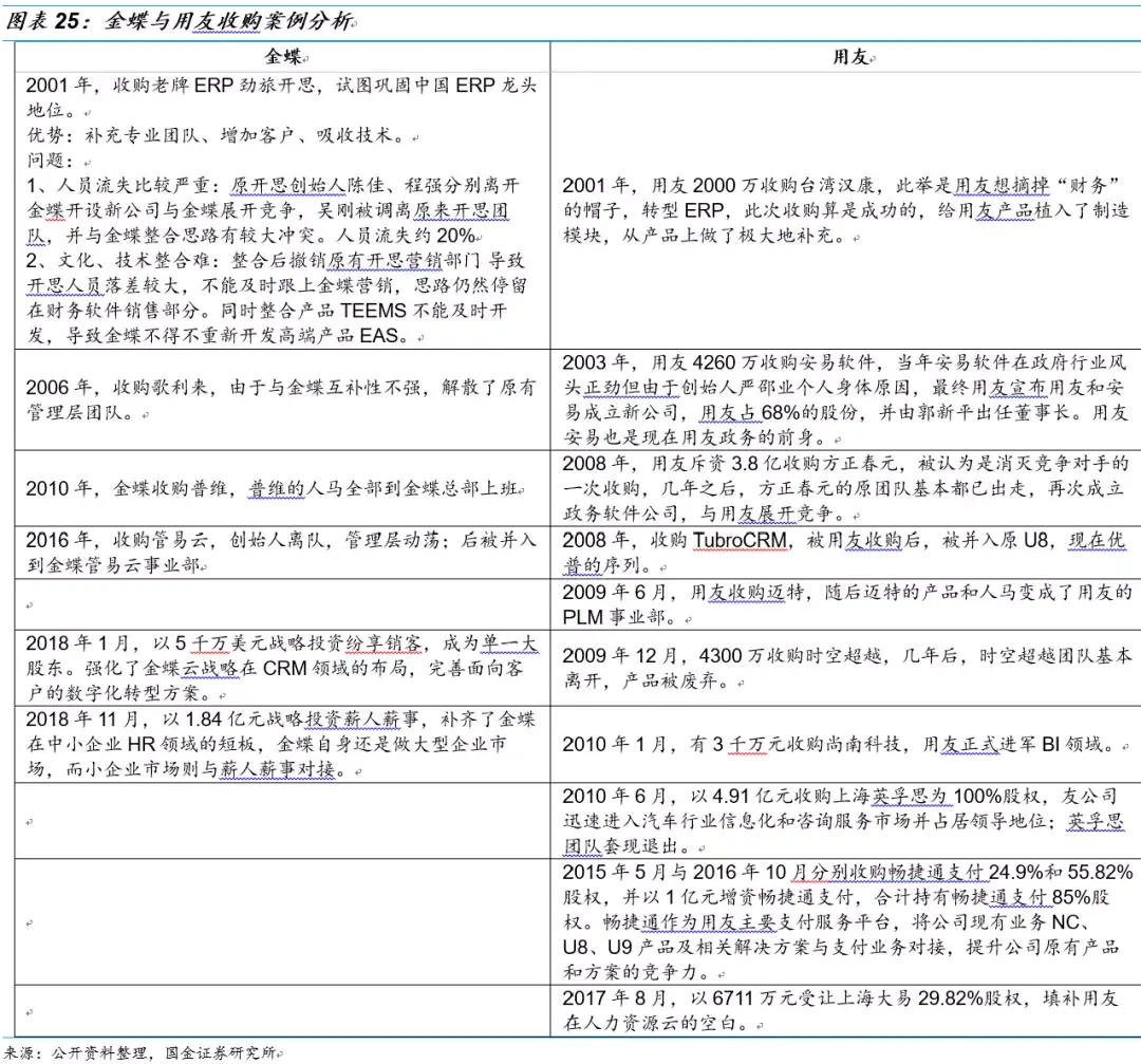 金蝶倾向于将产品完全收购进来后,吸收对方客户群体,再进行自己整合研发。从历史上看,金蝶整体收购数量小于用友,整合完成度也相对低一些,用友通过并购使得产品线布局更广,可用性更强。