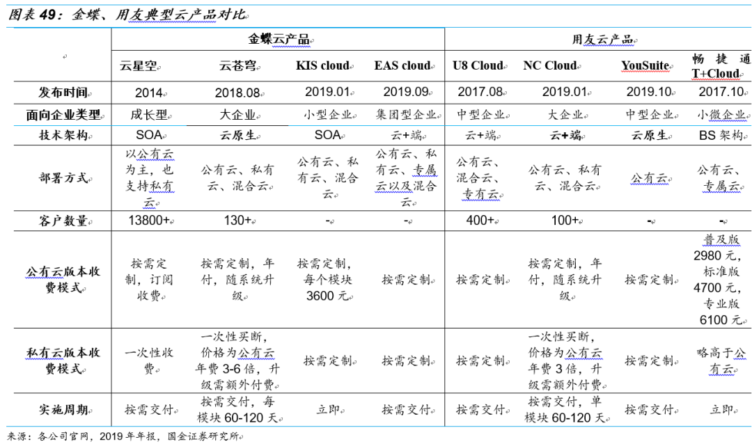 为了加速云转型,金蝶、用友均选择停售部分端产品以推进云产品推广进度。金蝶19年推出EAS Cloud、KIS Cloud,20年将停止K3 WISE、KIS旗舰版和KIS专业版等端产品销售。而用友于2019年推出NC Cloud后,也宣布原则上停售NC系列产品。