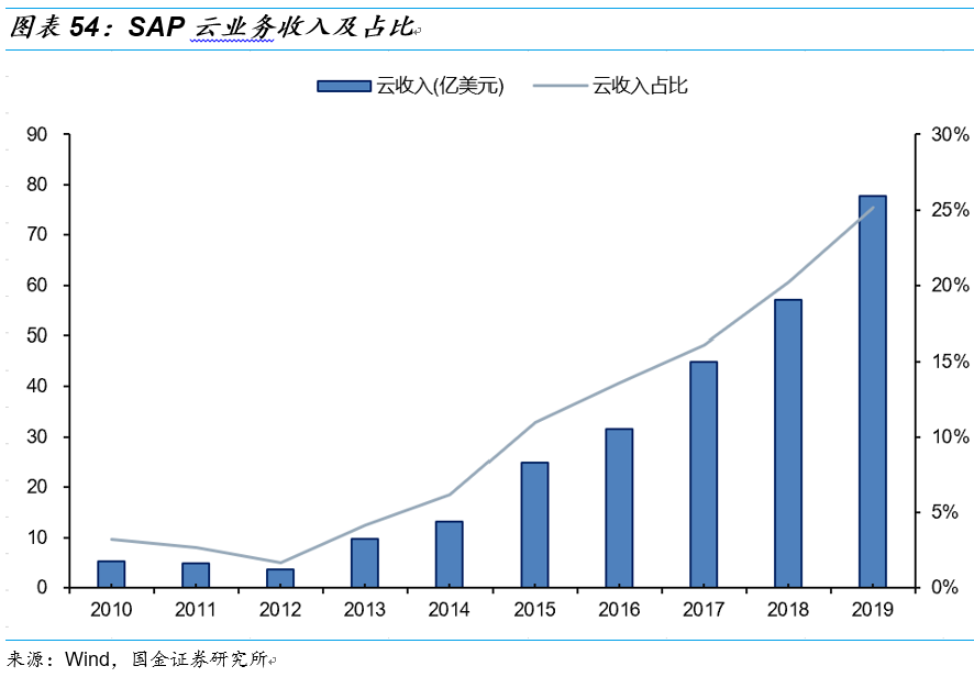 2020年2月27日,公司发布2019年年报,SAP云业务收入达到77.76亿美元,同比增长36.05%,云业务收入营收占总营收的比例达到25.16%,同比提升约5个百分点,提升明显。