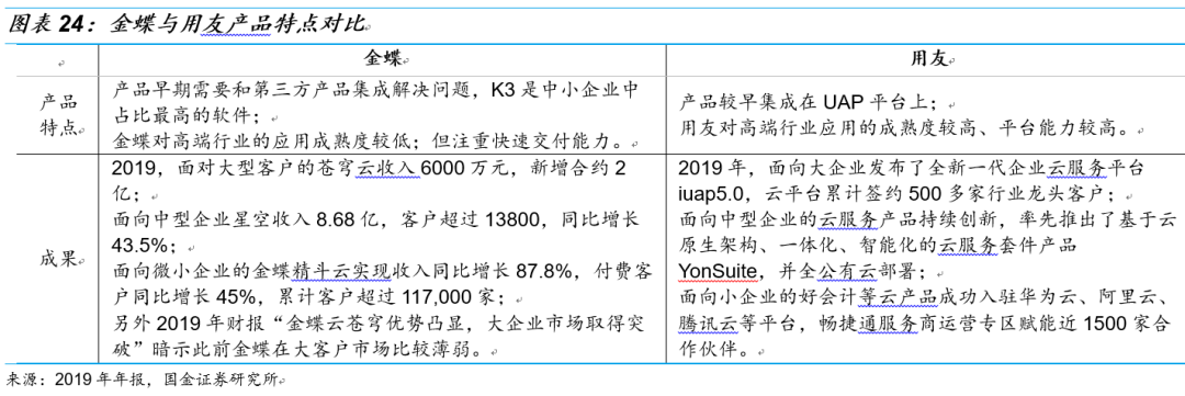 金蝶凭价格优势与快交付的策略在中型企业市场提升份额,同时公司率先启动云转型,促其产品更偏向轻量化、标准化。用友重视产品线成熟度和完整度,对于高端、大型企业的定制化和私有化需求,注重交付和定制能力。