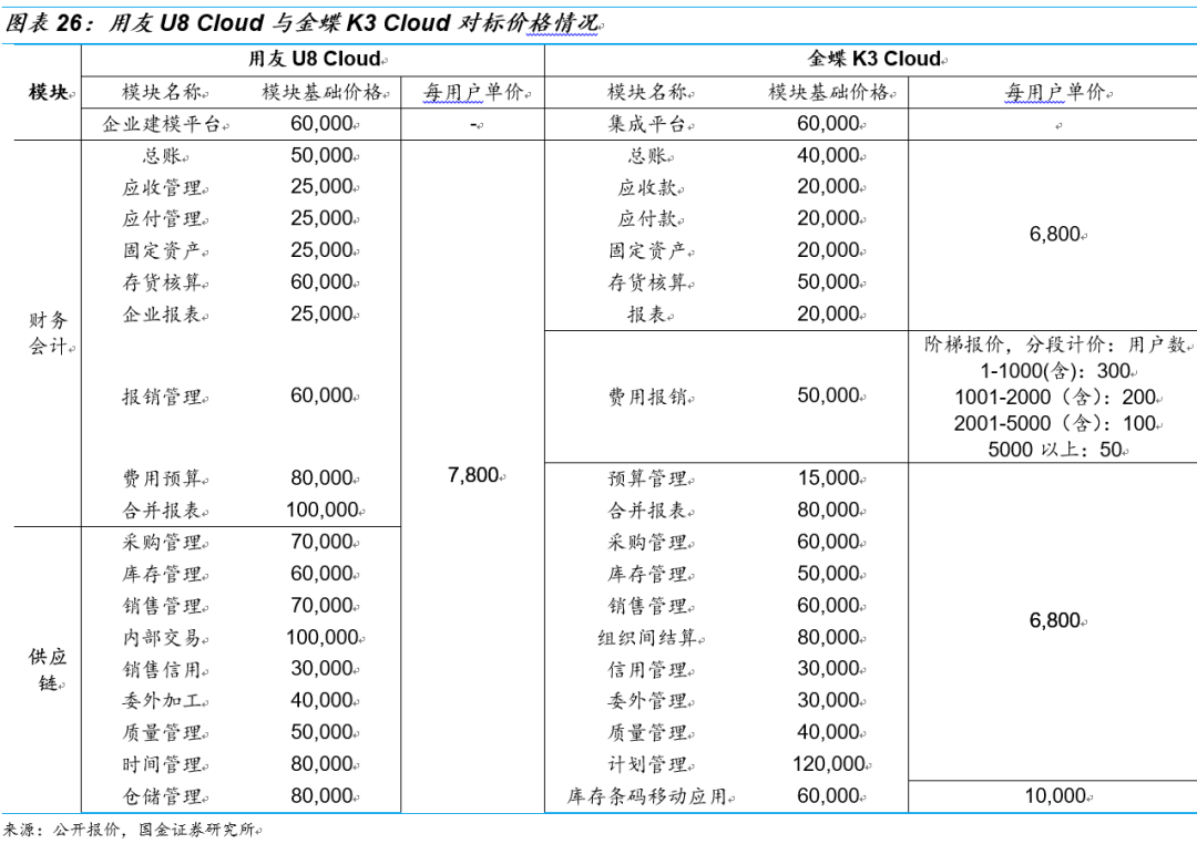 用友客户群体中大型客户更多,需求更多,客单价往往更高;其次,对于同样功能的产品License而言,用友的单价一般是金蝶的1.3倍左右;最后,从实施维度看,同样项目,用友所使用的人天也较金蝶更多。
