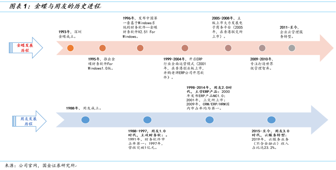1988-1997年,用友1.0时代,主攻财务软件:1991年,财务软件市占率第一;1997年,营收突破1亿元。1998-2014年,用友2.0时代,主营ERP软件:2000年发布ERP产品NC1.0;2001年,上交所上市;2009年,CRM/ERP/HRM国内市占率均为第一。2015年-至今,用友3.0时代,云服务转型:2019年,云服务业务(不含金融云)收入占比达23.2%。目前用友拥有全球分支机构230余家,生态伙伴5000余家,服务企业与公共组织客户超过522万家,引领企业服务领域。