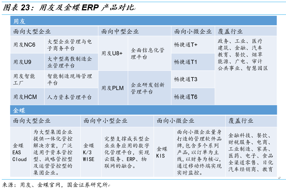 用友主要聚焦大型企业、央企以及部分国资企业;而金蝶依靠价格优势聚焦中小型企业。
