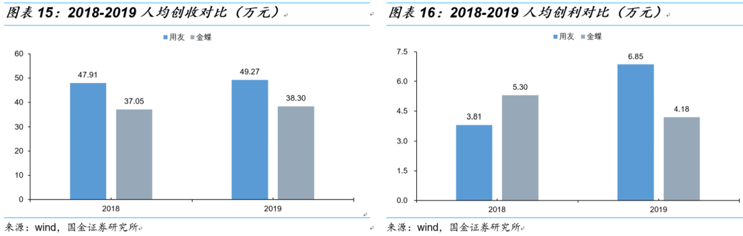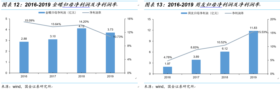 从增速来看,从2018年开始,受行业影响增速均呈放缓趋势,至2019年金蝶营收增速为18.33%,用友为10.46%,金蝶领先于用友。从收入体量上看,用友营收为85.10亿元,金蝶为34.10亿元,用友约为金蝶的2.5倍。
