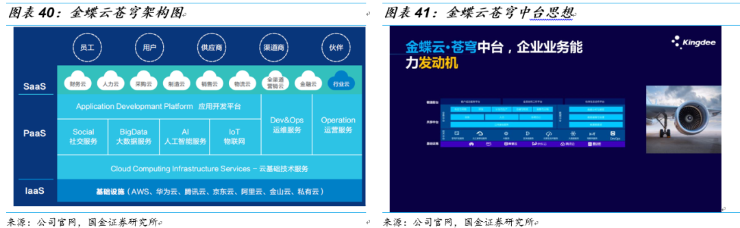 2019年,金蝶面向大企业推出苍穹云产品。苍穹云,架构上摈弃传统ERP单体架构,采用中台架构,包括业务中台、数据中台和技术中台等,并在国内率先采用云原生技术打造新一代的企业云服务平台。云苍穹以云计算标准IaaS、PaaS、SaaS三层架构构建:在IaaS层面,苍穹云具备高兼容性,兼容几乎所有主流的云IaaS厂商;在PaaS层面,苍穹云是一个企业级的高生产力PaaS,被称之为APaaS,目的是帮助企业提升SaaS开发效率,提升整体IT的生产力,开发效率可以提升两倍以上。在SaaS层面,苍穹云具有最完整的企业应用。因此,金蝶云苍穹是覆盖了IaaS、PaaS、SaaS三层的共生平台。同时,金蝶所定义的财务中台、业务中台和阿里有本质区别:阿里的前中后台架构中,将财务职能整体打包定位为后台的一部分;而金蝶的前台是赋能服务网络,中台是共享运营中心,后台是决策创新中心,实时交互、协同联动。