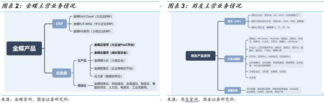 金蝶、用友云产品目前均支持多种部署方式并需要较重的交付,但SaaS化是未来共同的方向。
