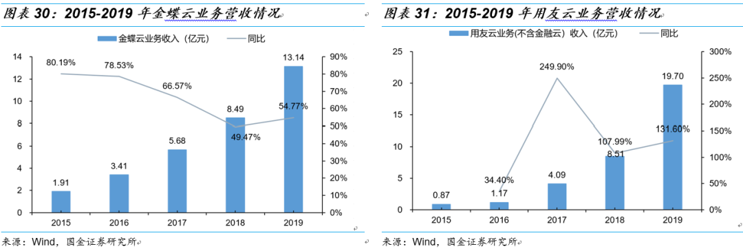 其中,ERP产品主要包括金蝶EAS Cloud(大型集团ERP)、金蝶K/3 WISE(中小型企业ERP)、金蝶KIS系列(小微企业ERP)。云服务业务主要包括云产品和领域云。其中,云产品主要为企业提供PAAS平台服务,包括云苍穹(大企业)、云星空(成长型企业)、精斗云(小微企业)、管易云(企业电商云平台)、云之家(智能协同云);领域云主要为license产品,包括财务云、供应链云、渠道云等。2019年年报显示,金蝶云服务业务同比增长54.7%,占集团整体收入39.5%,其中金蝶云苍穹作为国内首款自主可控及云原生架构的大企业云服务平台,在大企业市场取得突破,实现收入近6000万元,获得130家新客户;金蝶云星空持续保持出色态势,收入同比增长43.5%,客户续费率高达90%,累计服务客户超过13800家,同时大力发展公有云渠道,累计公有云渠道客户近4000家。