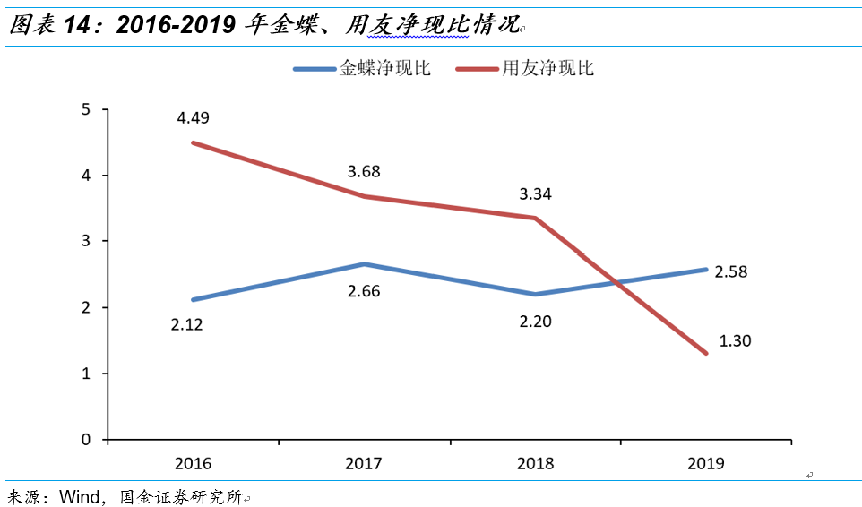 2016年开始,金蝶净现比从2.12提升至2.58,稳定维持在2.0以上,说明公司净利润中现金量比例较大,公司盈利质量好,现金流充足。用友净现比,自2016年开始逐年递减,至2019年用友净现降至1.30,说明公司现金流呈现逐年下降趋势。