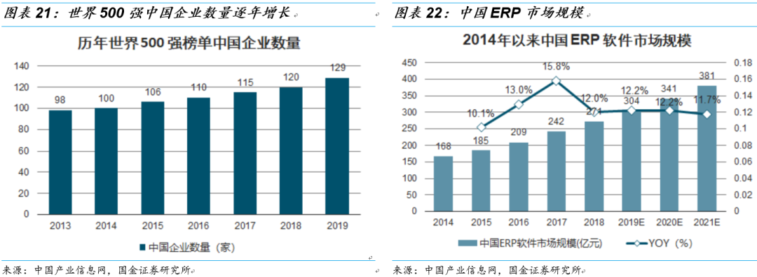 随着中美贸易摩擦不断升级,国家将持续在政策、资金等方面对硬件设施及基础软件行业进行支持,ERP作为企业信息化及企业管理系统的核心,全面管控企业生产和经营,其信息安全性问题越发受到重视。2019年,世界500强企业中,中国企业数量129家,随着高端市场对于ERP国产替代的需求增加,ERP自主可控将成为必然趋势,特别是在央企、国资企业、大型跨国企业以及关键行业等高端ERP市场,仍有超过50%市场被国外厂商占据,替代空间近百亿,国产ERP厂商业务量有望迎来新一轮增长。