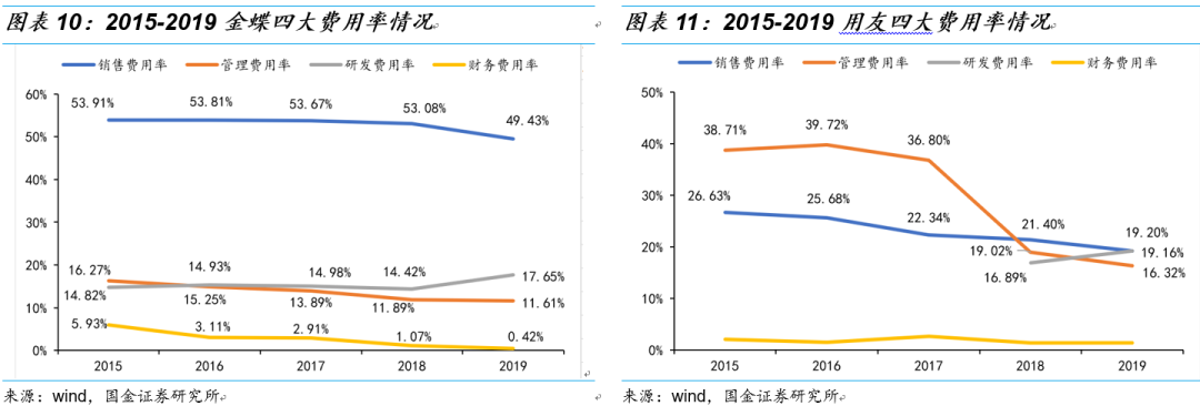 根据2015-2019年费用数据统计,金蝶销售费用率最大,2015-2018年均在53%以上,2019年有所下降,为49.43%,但仍然处于较高水平。而用友则在管理方面花费较大,2015-2017年管理费用率年均在36%以上,2018年开始用友有意控制管理费用,管理费用率大幅下降,到2019年降至19.20%。从研发费用率来看,2018-2019年用友研发费用率要高于金蝶2个百分点左右。用友在管理和研发方面投入较大,而金蝶在销售方面投入较大,这与两家企业的产品类型及客群对象有关,用友产品重项目集成、大客户较多,客户粘性相对较强;而金蝶客群以中小企业为主,客户忠诚度较弱,需不断开发维护,因此销售投入较高。