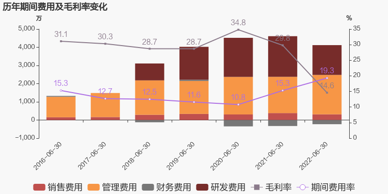 公司2022半年度营业成本1.72亿元,同比下降12.5%,低于营业收入28.2%的下降速度,毛利率下降15.3%。期间费用率为19.3%,较上年升高4%。