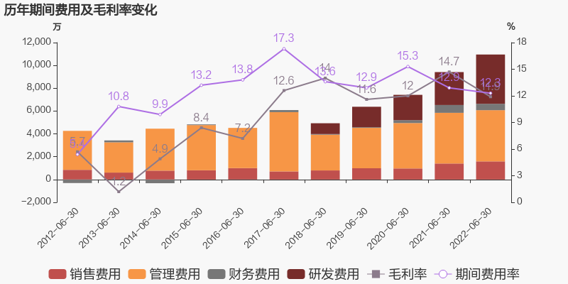 公司2022半年度营业成本7.83亿元,同比增长25.7%,高于营业收入21.6%的增速,导致毛利率下降2.9%。期间费用率为12.3%,较去年下降0.6个百分点。