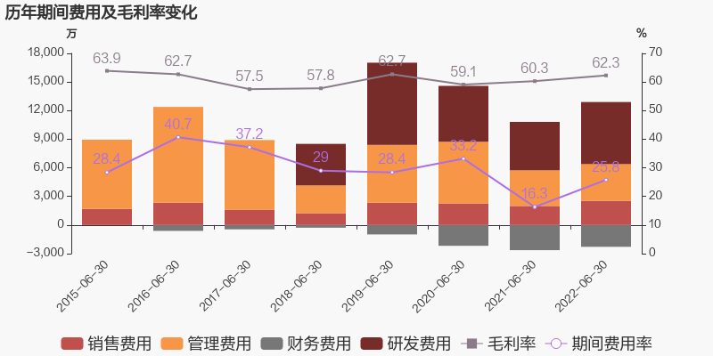公司2022半年度营业成本1.55亿元,同比下降22.6%,高于营业收入18.3%的下降速度,毛利率上升2.1%。期间费用率为25.8%,较上年升高9.6%。经营性现金流大幅上升285.2%至5955万元。