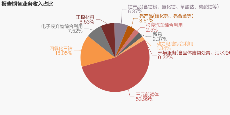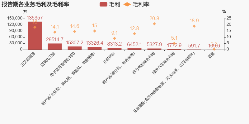 从业务结构来看,“三元前驱体”是企业营业收入的主要来源。具体而言,“三元前驱体”营业收入为75.18亿元,营收占比为54%,毛利率为18%。