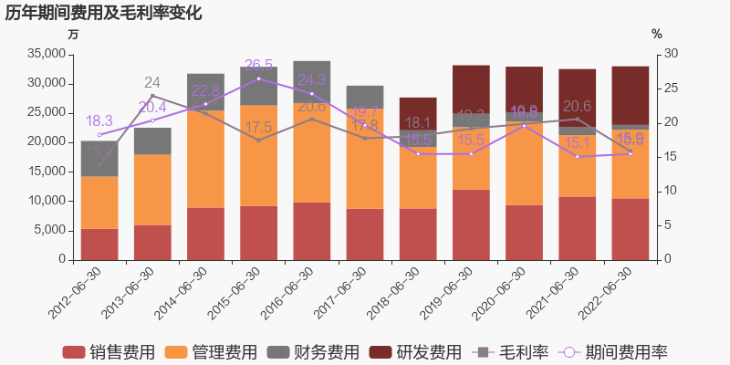公司2022半年度营业成本17.88亿元,同比上升4.5%,营业收入同比下降1.3%,毛利率下降4.7%。期间费用率为15.5%,同去年相比变化不大。经营性现金流大幅下降51.6%至1.53亿元。