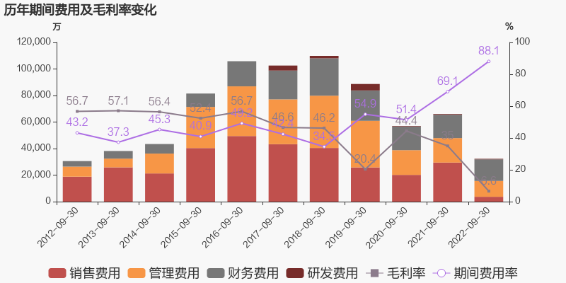 公司2022三季度营业成本3.42亿元,同比下降44.9%,低于营业收入61.7%的下降速度,毛利率下降28.4%。期间费用率为88.1%,较上年升高19.1%。经营性现金流由2.72亿元下降至-5462万元,同比下降120.1%。