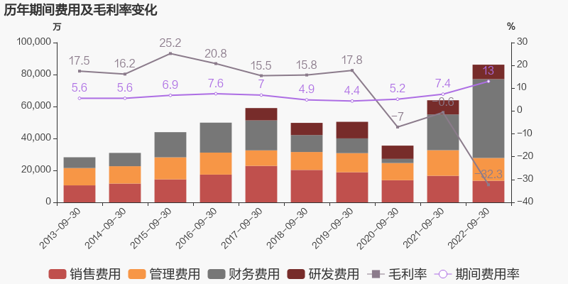 公司2022三季度营业成本87.4亿元,同比上升0.6%,营业收入同比下降23.5%,毛利率下降31.8%。期间费用率为13%,较上年升高5.6%。经营性现金流大幅下降94.9%至9431万元。
