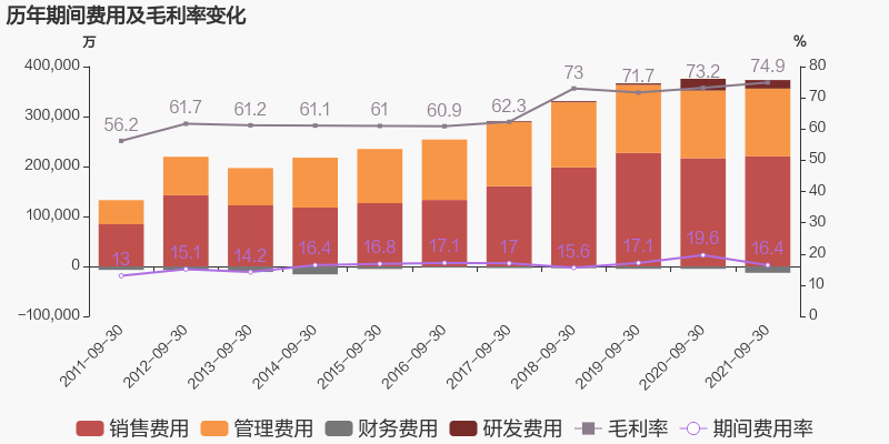 公司2021三季度营业成本55亿,同比增长8.5%,低于营业收入16%的增速,导致毛利率上升1.7%。期间费用率为16.4%,较去年下降3.2%,费用管控效果显著。经营性现金流由-4.4亿增加至54.7亿,同比上升1332.8%。