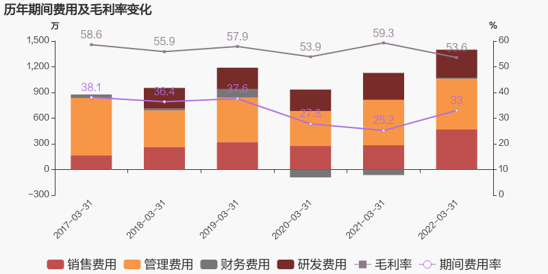 公司2022一季度营业成本1966.4万,同比增长14.4%,高于营业收入0.4%的增速,导致毛利率下降5.7%。期间费用率为33%,较上年升高7.8%。经营性现金流大幅下降97.3%至13.7万。