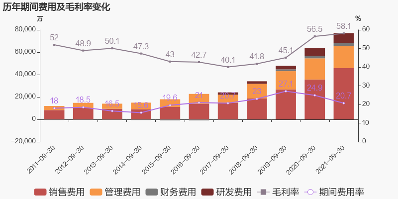 公司2021三季度营业成本15.6亿,同比增长39.9%,低于营业收入45.2%的增速,导致毛利率上升1.6%。期间费用率为20.7%,较去年下降4.2%,费用管控效果显著。