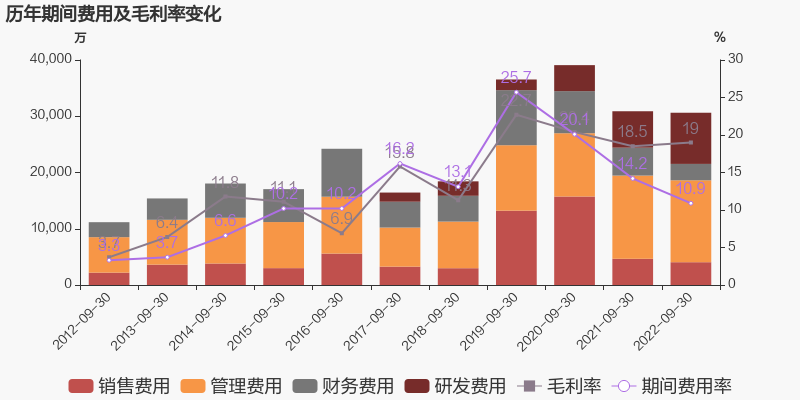 公司2022三季度营业成本22.85亿元,同比增长29.3%,低于营业收入30.1%的增速,导致毛利率上升0.5%。期间费用率为10.9%,较去年下降3.4%。