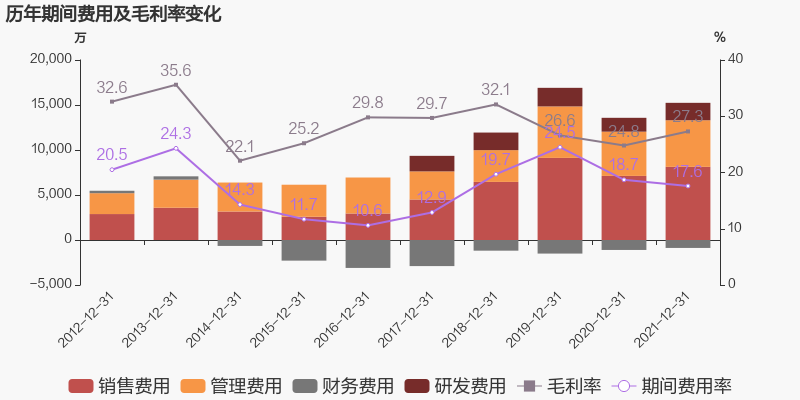 公司2021年营业成本5.9亿,同比增长18.3%,低于营业收入22.4%的增速,导致毛利率上升2.5%。期间费用率为17.6%,较去年下降1.1%。经营性现金流大幅下降81.2%至1185.5万。